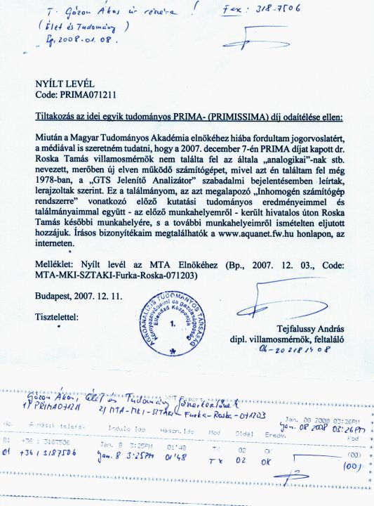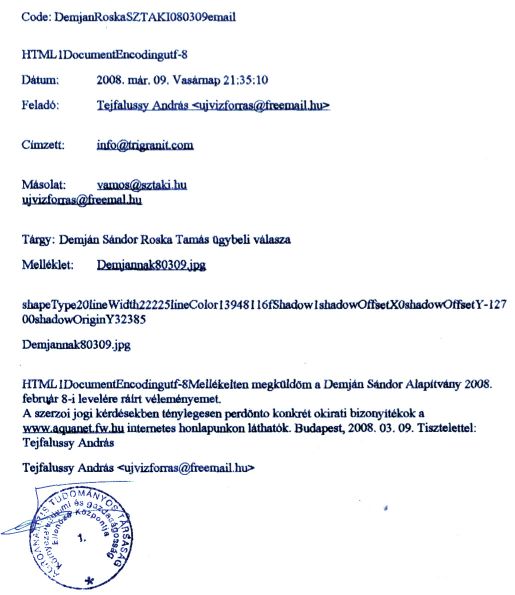 Mellékletként csatoltam az akadémiai elnökségi hamis állásfoglalást ismertetõ publikációt (1), Az (2-5) számmal hivatkozott többi dokumentumot lásd a Dr. Pannonhalmi Kálmán úr MTA elnökségi titkárság vezetõ részére f. hó 10-én a titkárságukon CD-n személyesen átadott www.aquanet.fw.hu internetes honlap CD másolaton, az mta.html file-ban, ill. a (6-7) dokumentumot az OETIfajirtoCsalása.html file-ban, a (8) dokumentum gyûjteményt pedig a mellekvesekerges.html file-ban.